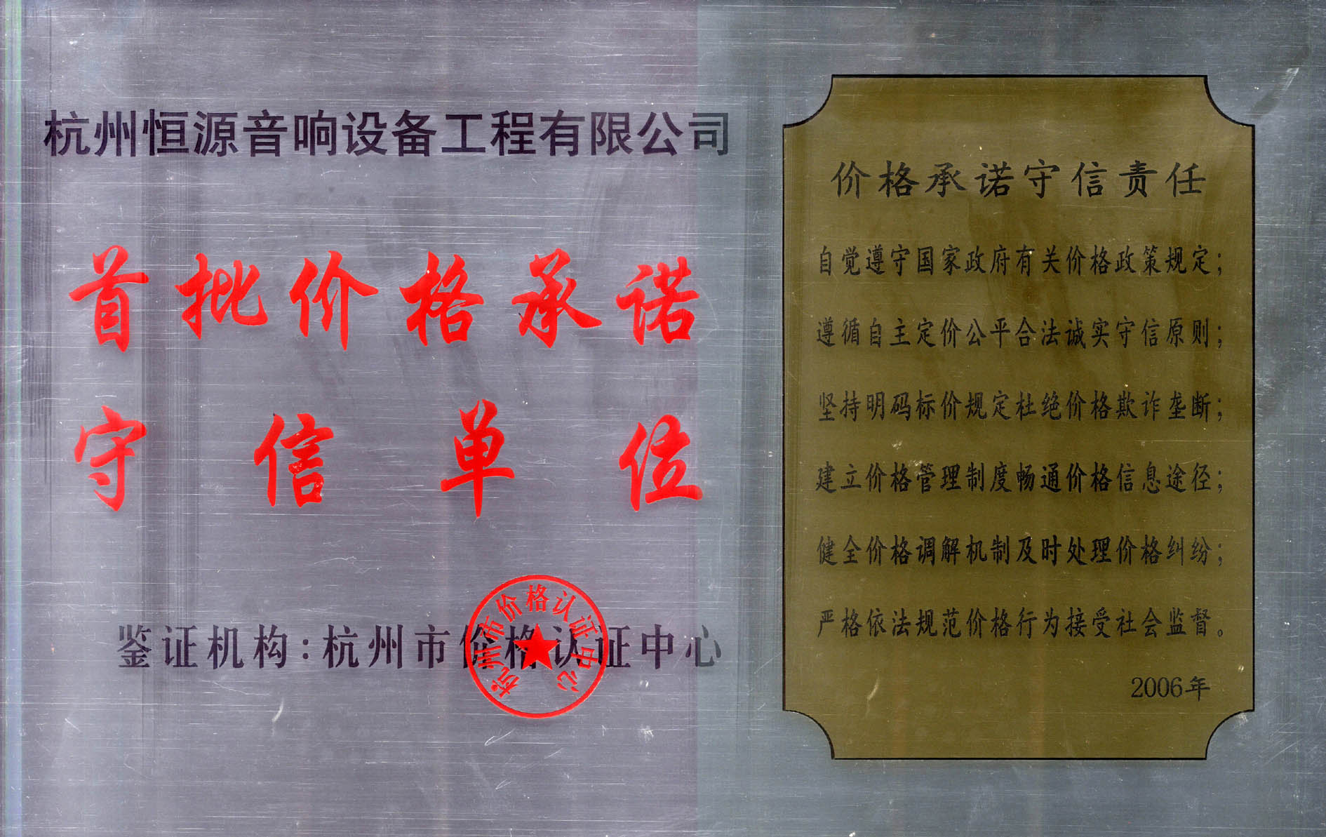 杭州恒源音响设备工程有限公司 2006年被杭州市价格认证中心认证为杭州市首批价格承诺守信单位!