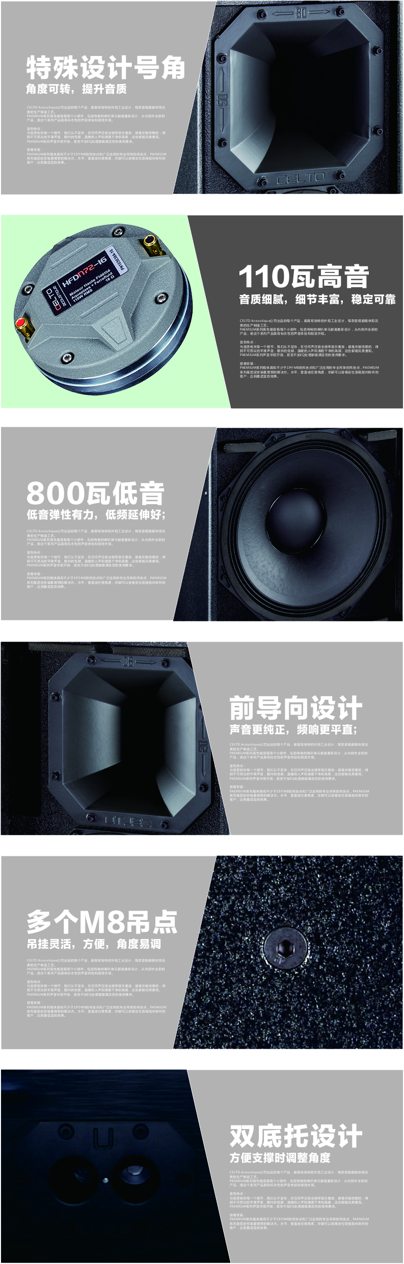 CT系列是CELTO Acoustique公司2016年推出的高性价比产品,CT系列产品在音色方面,会更靠近HiFi的味道,但又具备了专业的风格。全频音箱采用对称斜角的箱体设计,既可以用作主扩,又可以用做舞台监听;这款音箱的把手采用了人体工程学设计,让搬动音箱的时候,更舒服,省力,提高安装效率。音箱箱体具有十多个吊点,让吊挂更加方便灵活。