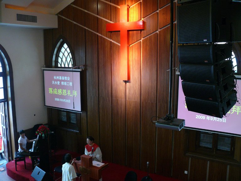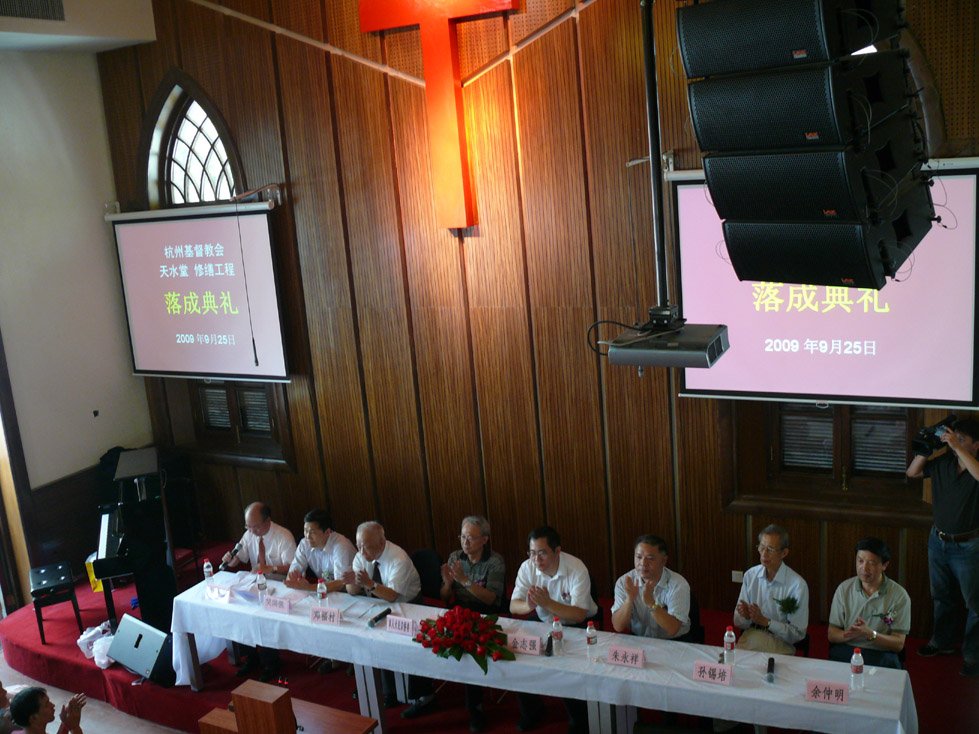 最后落成典礼由倪光道牧师作小结讲话,倪牧师表示杭州基督教界一定会认真做好基督教的各项工作,积极引导信徒参与社会服务事工、依法管理教会事务,为杭州的经济建设、社会发展作出更大的贡献,在创建和谐教堂的活动中再立新功。杭州市为世界级旅游胜地.此单位为杭州市重点保护单位.对工程质量和施工单位的要求非常之高.我司经过甲方和有关部门审核及与其它单位的比较.最终甲方选择我司为此项目的合法施工单位.我司在此项目上采用了我司浙江省一级代理的品牌LAX作为此项目的扩声系统!我司在此项目中采用了锐丰的线性阵列AT108系列音箱为主扩声;二楼及附楼补声方面则采用了LX208;返送用了锐丰经典的小体积大声压台唇返送系列U08.舞台拾音方面用上了台湾JTS话筒.在此项目中不管在箱体吊装;设备搭配及系统调试等方面中都发挥了极高的承前启后专业水准.使得此项目不论音色;采音及厅堂声场饱和度都达到专业音响的极高的水平.项目验收阶段经杭州市众多专业人士及市委市政府等领导同志用心聆听之后都频频点头.一致认为此项目为同行业中的高水平工程!恒源工程团队所有人员在当天都受到委市政府等领导同志及甲方相关人士的高度评价及一一握手问候;并现场赠送开堂典礼纪念品作为感谢!令在场所有人员为之感动.